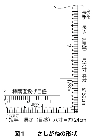 まず、さしがねの形状についてご説明します。(図1) さしがねの長い部分(長手)は1尺6寸5分=約50cmまで目盛りが刻まれています。 この長さは、関東間(6尺)、本間(6尺2寸)、関西間(6尺5寸)の4分の1(四ツ割:間柱の位置)の長さを基準として定められています。  短い部分(短手)を8寸=約24cmとしていますのは、707(7寸7厘)=裏目の5寸を測れるのと、道具箱に収まることや現場での使い勝手の良さなどから、この長さに作られています。