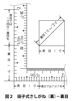先ず、さしがねの目盛は昔からどのようにできているかをご説明したいと思います。第2回目では、さしがねの形状(長手、短手)がどのように決められたのか、そしてさしがねの裏目が表目の√2(1.41421356)倍に刻まれていること。これは、日本建築が90度(直角)と45度の隅木の形状が多く取り入れられていることからであり、これを裏目として目盛った先人の知恵に感謝いたしたいと存じます。また、丸目尺についてもご説明申し上げました。