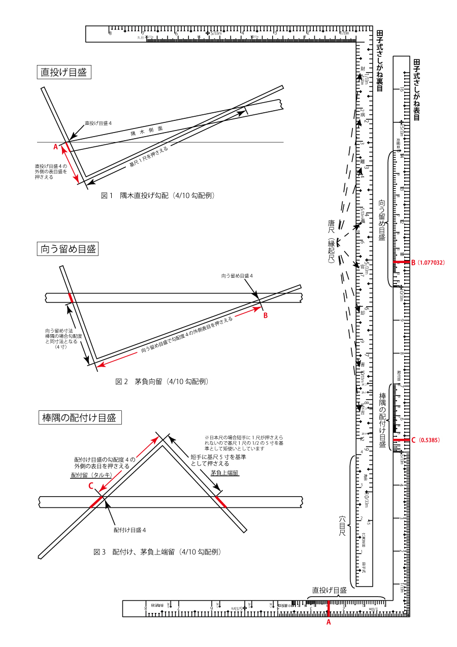 唐尺(縁起尺)は昔、吉凶判断に用いられていたもので、さしがねによっては1尺2寸を八つ割にしたものと9寸6分を八つ割にしたものがあるようで、財・病・離・義・官・劫・害・吉の文字が刻まれています。昔は門戸の寸法を決めるとき等に財・義・官・吉の吉寸を使用したとの文献も残っているようです。次に、直投げ目盛、向う留め目盛、棒隅の配付け目盛の使用方法については図1~図3にさしがねの当て方として説明しています。詳細につきましては、次回以降の規矩術のご説明の中で詳しく述べさせていただくつもりです。