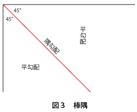 棒隅の場合には、図3のように2つの平勾配が45度に交わって四角い隅を作る時、この稜線が隅勾配となります。また、平勾配と隅勾配の関係は図4のようになります。