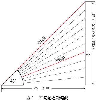平勾配とは、梁間(はりま)を「殳」、束(つか)立ちを「勾」として、垂木が構成する傾斜のことを言います。図1において勾が1尺となるまでは平勾配と言います。また、1尺の殳に対し勾が4寸だと4寸勾配となります。