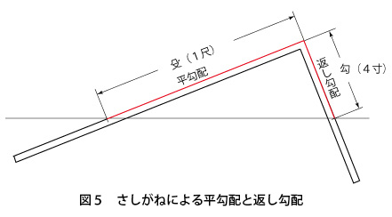 次に、さしがねによって平勾配、返し勾配を求める方法として、例えば4寸勾配の平勾配や、その返し勾配の墨付けを行う場合のさしがねの当て方を図5に示します。