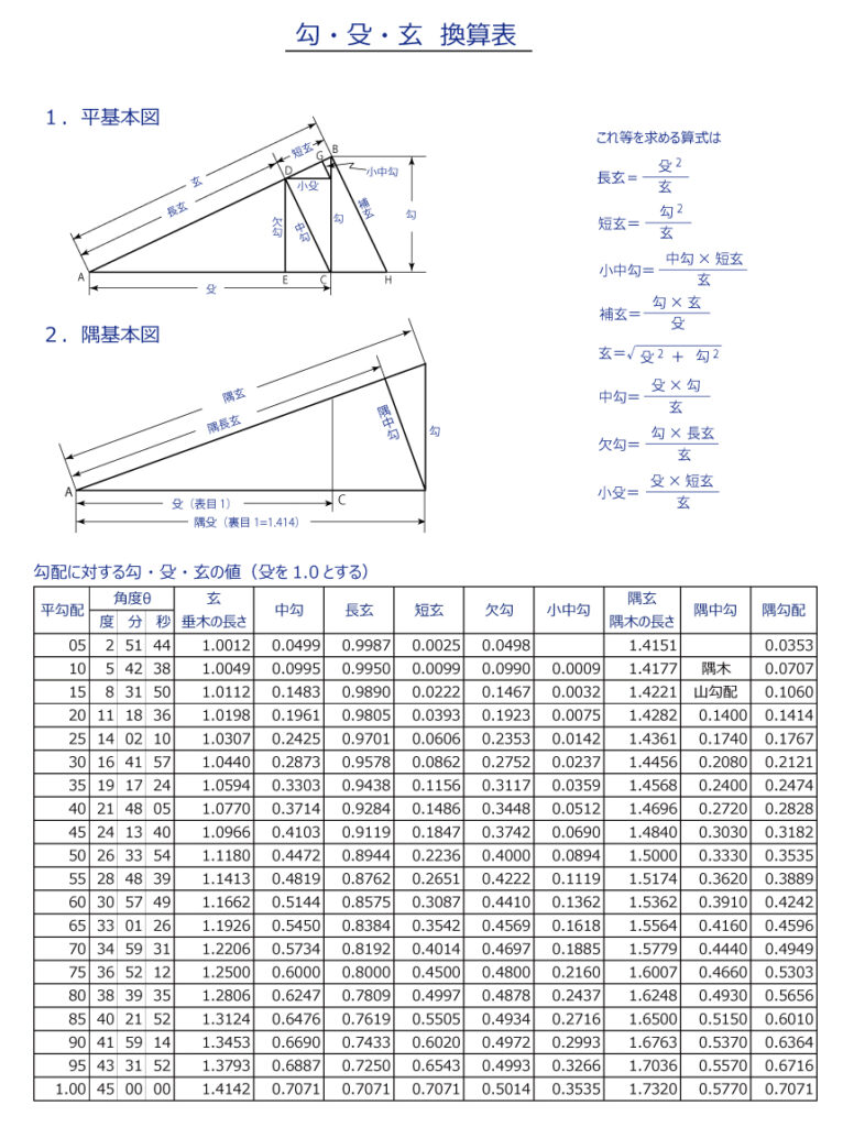 前回は、平勾配と返し勾配、矩勾配、隅勾配を説明し、勾・殳・玄法の平基本図、隅基本図の名称を説明し、0.5勾配から矩勾配までの勾・殳・玄換算表を添付させていただきました。殳を1.0とする表であり、尺でもセンチでもご利用いただけると思います。