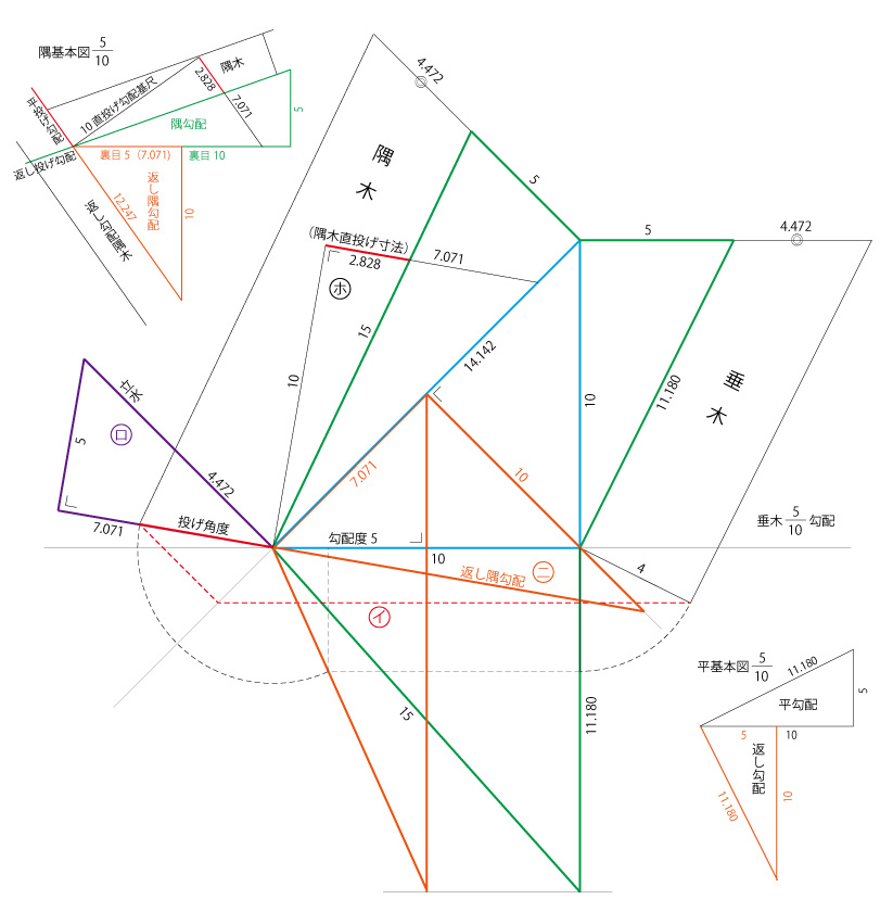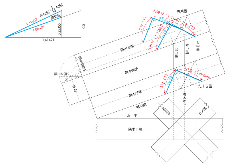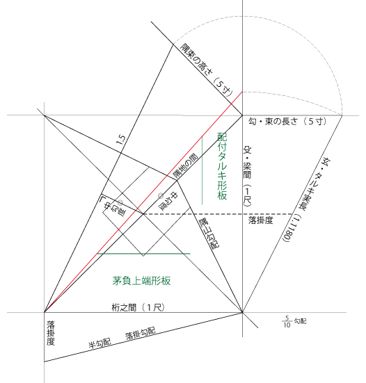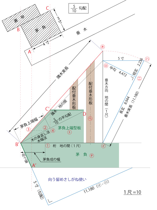 4.さしがね使いでは、地の間1尺と垂木の実長(11.180延び)を二分の一矩にして5寸と5.59となり、長いほうで墨をすれば配付け垂木の角度、短い5寸で墨をすれば茅負上端留めとなります。