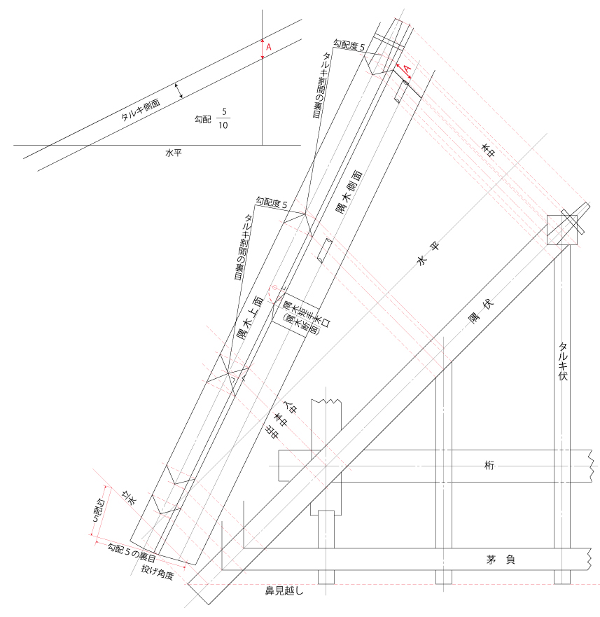 茅負、裏甲、そして鼻隠し、淀など垂木勾配なりに転ぶ上端留め及び向こう留めの展開図法と勾・殳・玄法による求め方さらに木の身返しを説明いたします。