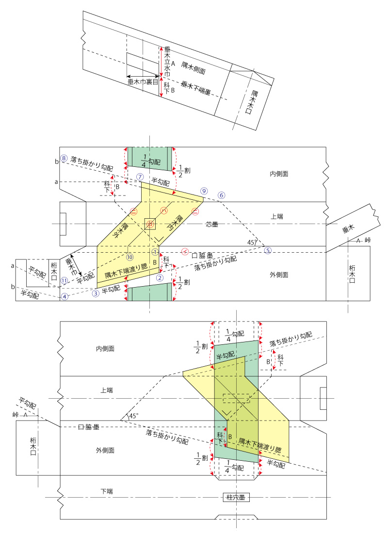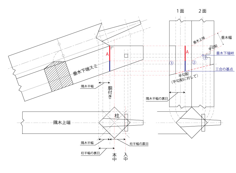 ハ、③から隅木半幅を裏目で戻り、隅木側面が束面と合う位置を隅木胴付きとし、これを三合の基点として、棒隅の場合、半勾配を引き渡します。