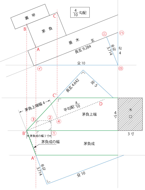 B’~Dに平勾配を引き渡し茅負上端幅を平勾配なりに④と定め矩をまくとC’の点が求められます。