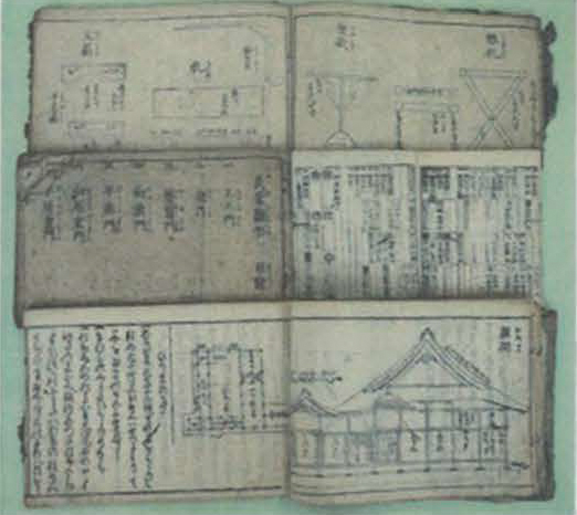また、武家雛形目録の本が数冊あり、武家の間取り、馬小屋の造りから馬の餌箱の大きさまで記された、武家に纏わる机から馬の爪切り台の寸法まで、こと細かく、武家が使う生活用品と城で使う、今でいう業務用品の寸法本、ここにはさしがねの吉寸法での割付寸法が随所にみられ、唐尺の寸法が使われているように思います。このような文献からも、お城関係の大工の仕事をしていたと推察できます。