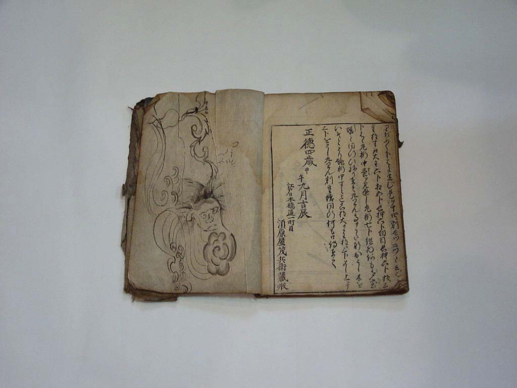 富蔵の資料は少なく、初代が所蔵し勉強していたといわれる本と、お城に纏わる本があります。五代目(光一郎)の話によると、富蔵は藩の出入りの大工であり、絵が非常にうまい人だったと聞いております。江戸日本橋の本を所持しており、その本に富蔵が描いた絵といわれる物がたくさんあります。